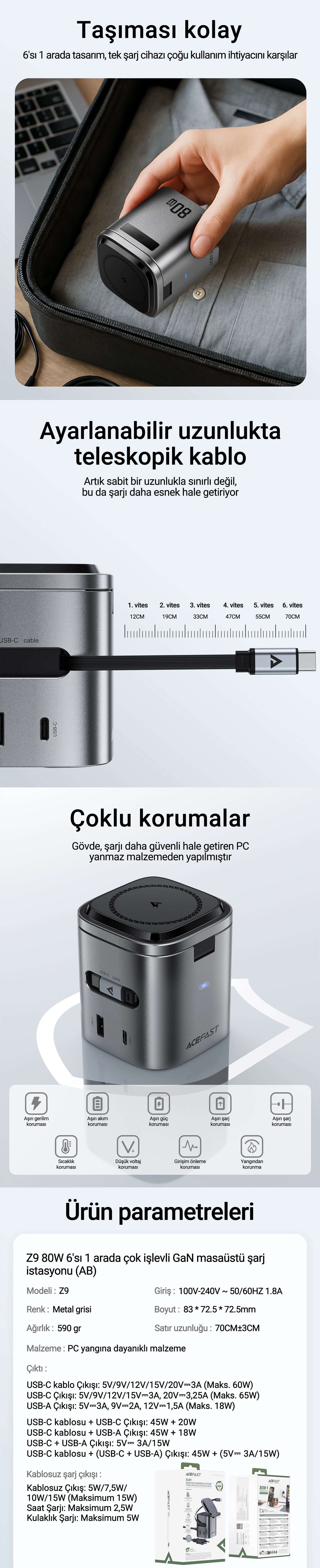 Acefast 6'sı 1 arada GaN 80W Masaüstü Hızlı Kablosuz Şarj İstasyonu - Üç kablosuz çıkış, 3'ü 1 arada - Z9 (Acefast Türkiye Garantili)